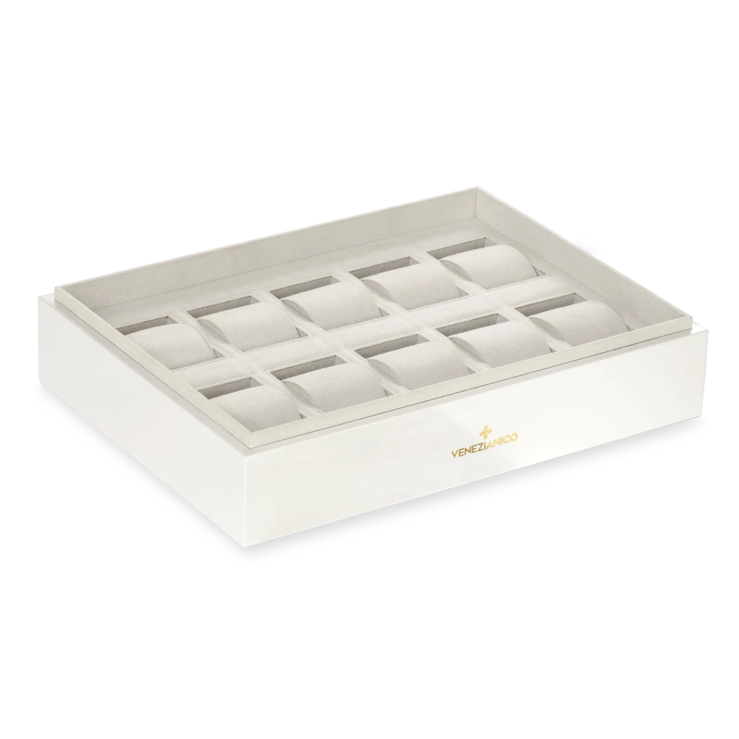 This case is an elegant treasure chest designed for watch enthusiasts. Handcrafted from ivory-lacquered wood and lined with soft beige microfiber, it holds up to 10 timepieces, providing a secure and protective environment. The exterior features the Venezianico logo in a gold finish—a signature hue of the brand—adding a distinctive mark of identity to an object created for the most passionate collectors.