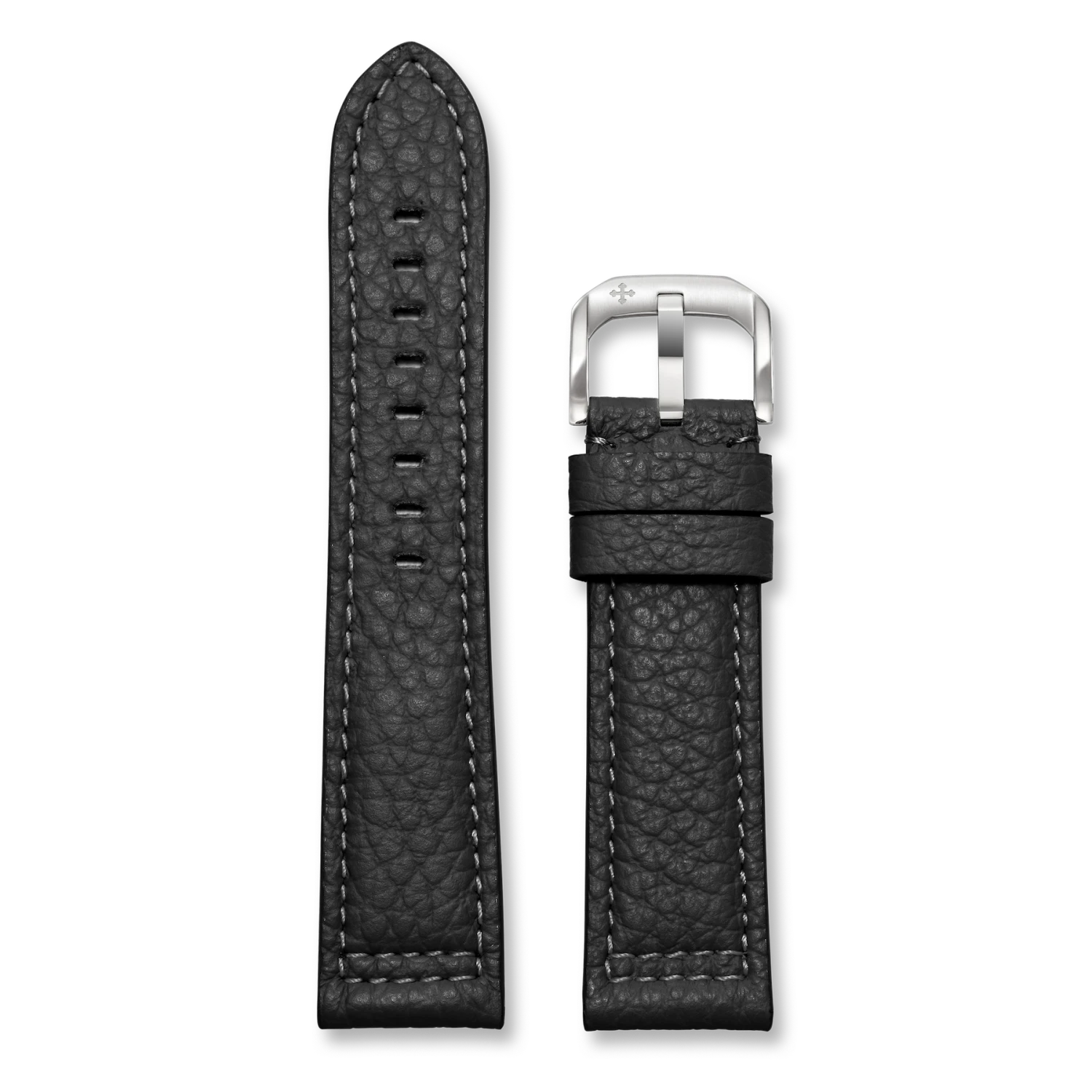 Handcrafted in Italy using traditional techniques, this embossed black leather strap showcases a unique, textured surface created by engraved brass rollers. The irregular pattern enhances the natural softness of the leather while increasing its durability, offering both elegance and longevity.