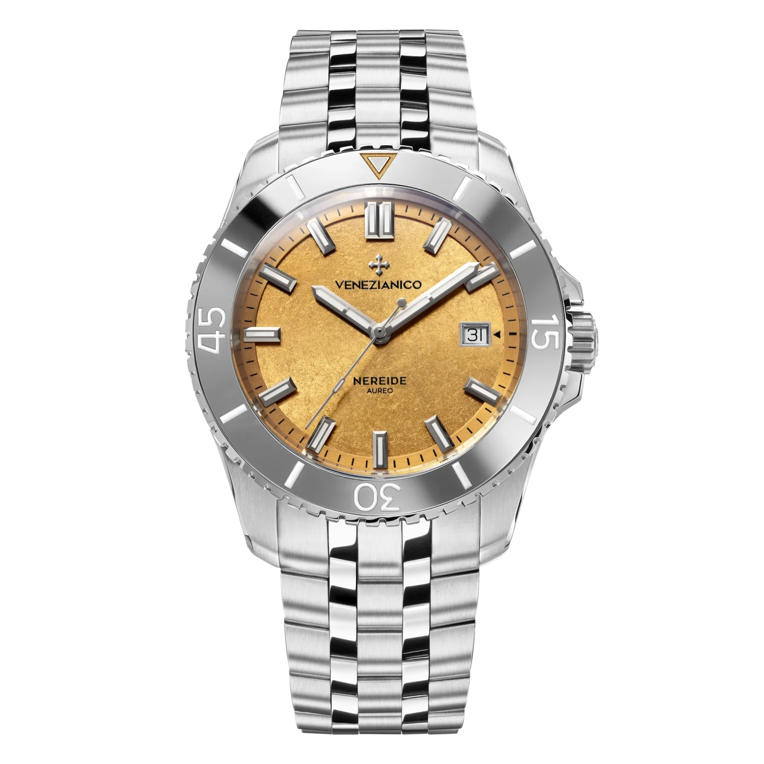 The Nereide Aureo is a dive watch that combines elegance and innovation. Its dial, adorned with a pure 24k gold treatment and a rippled finish, evokes the ancient Venetian art of lamination. The robust 316L stainless steel case, paired with a tungsten bezel, seamlessly integrates with the new Sansovino bracelet, featuring polished and satin-finished links and a micro-adjustable clasp that ensures durability and maximum comfort on the wrist.
