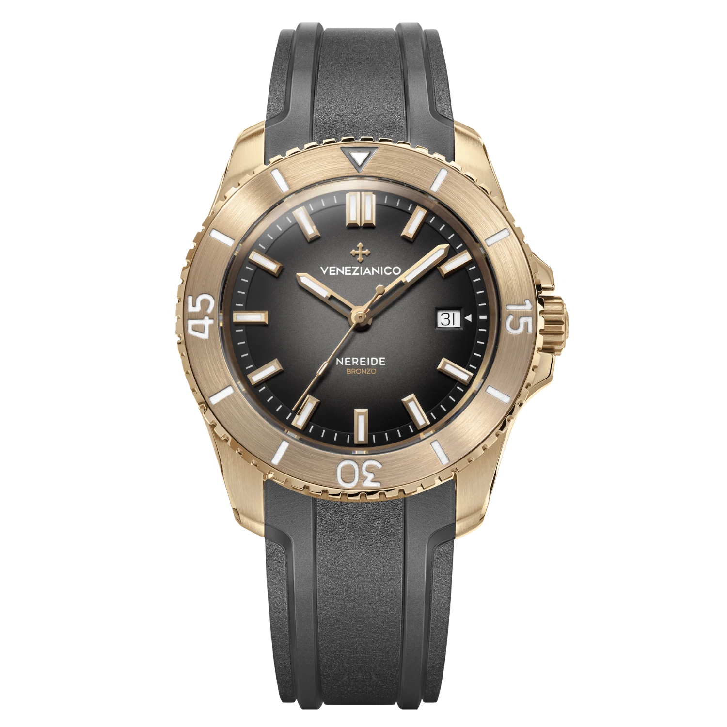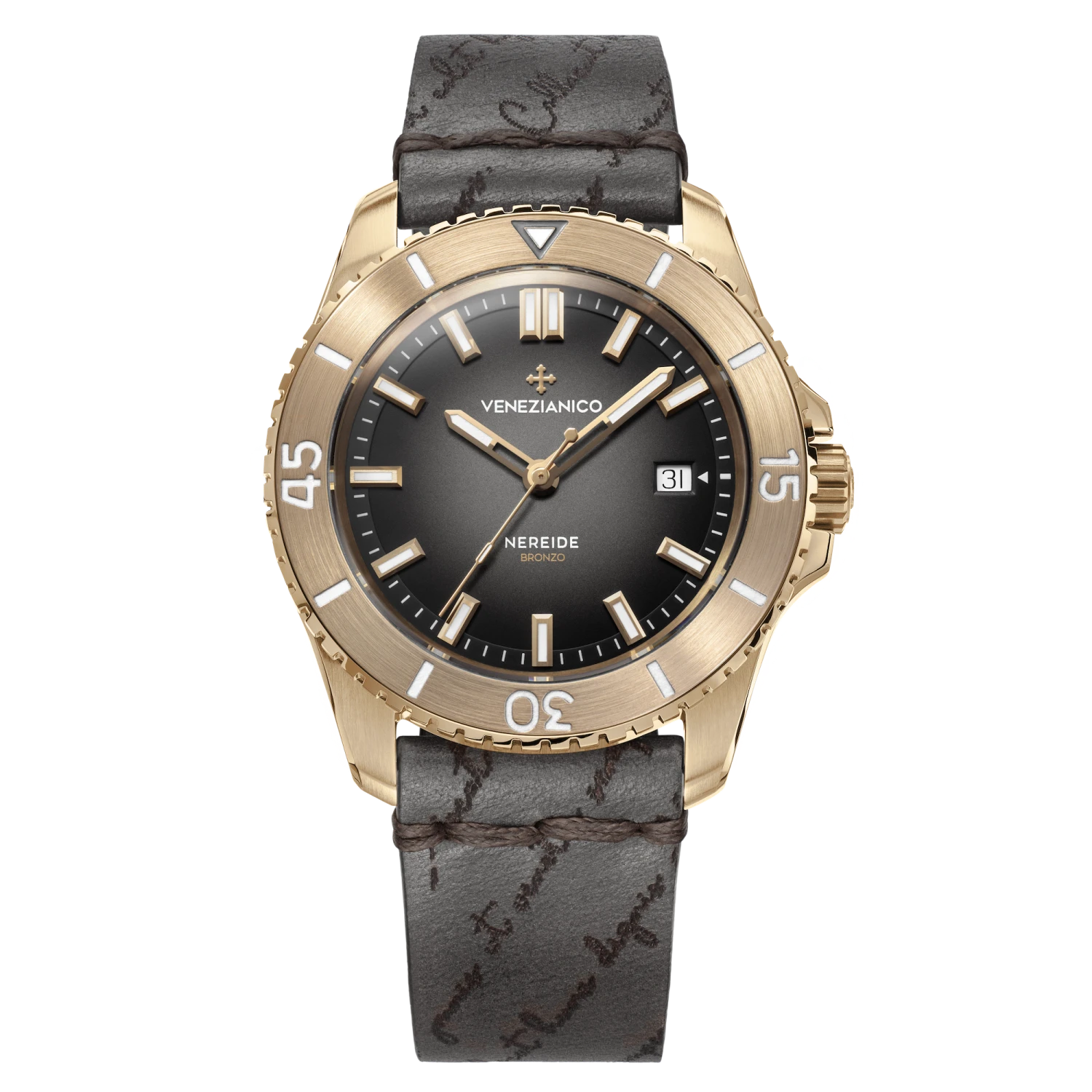 The Nereide Bronzo, inspired by the metal of the famous Horses of St. Mark, embodies the timeless charm of this material, an essential part of the history of Venetian craftsmanship. The case, carefully finished, evolves over time, developing a unique patina that tells endless stories.