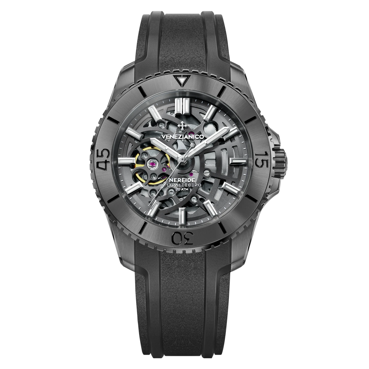 Ultraleggero is the most innovative watch in the Nereide series. It draws inspiration from the Vitruvian Man, symbolizing the Renaissance and the close connection between art and science. The peculiar shape of the skeletonized dial fits perfectly with the body of the movement, through an original patented system that guarantees greater lightness and less bulk.