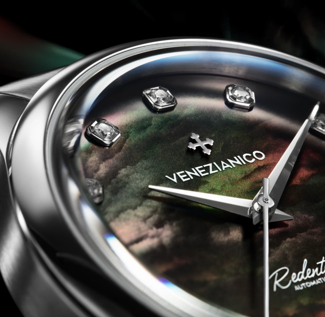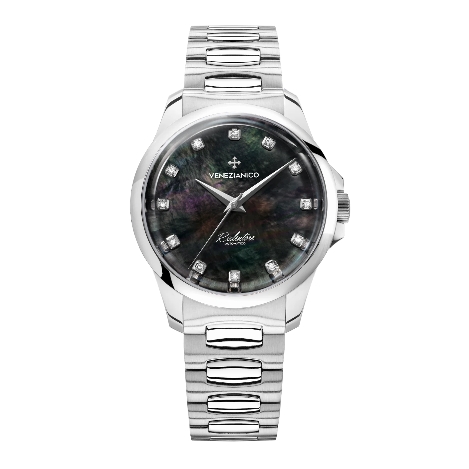 This particular model is our first unisex watch with diamonds. Twelve stones, carefully chosen by our team, adorn the black mother-of-pearl dial, making this model the most precious among our timepieces with a dark dial. Redentore Diamanti combines elegance with the brilliance of diamonds, the perfect choice for those who love precious items.