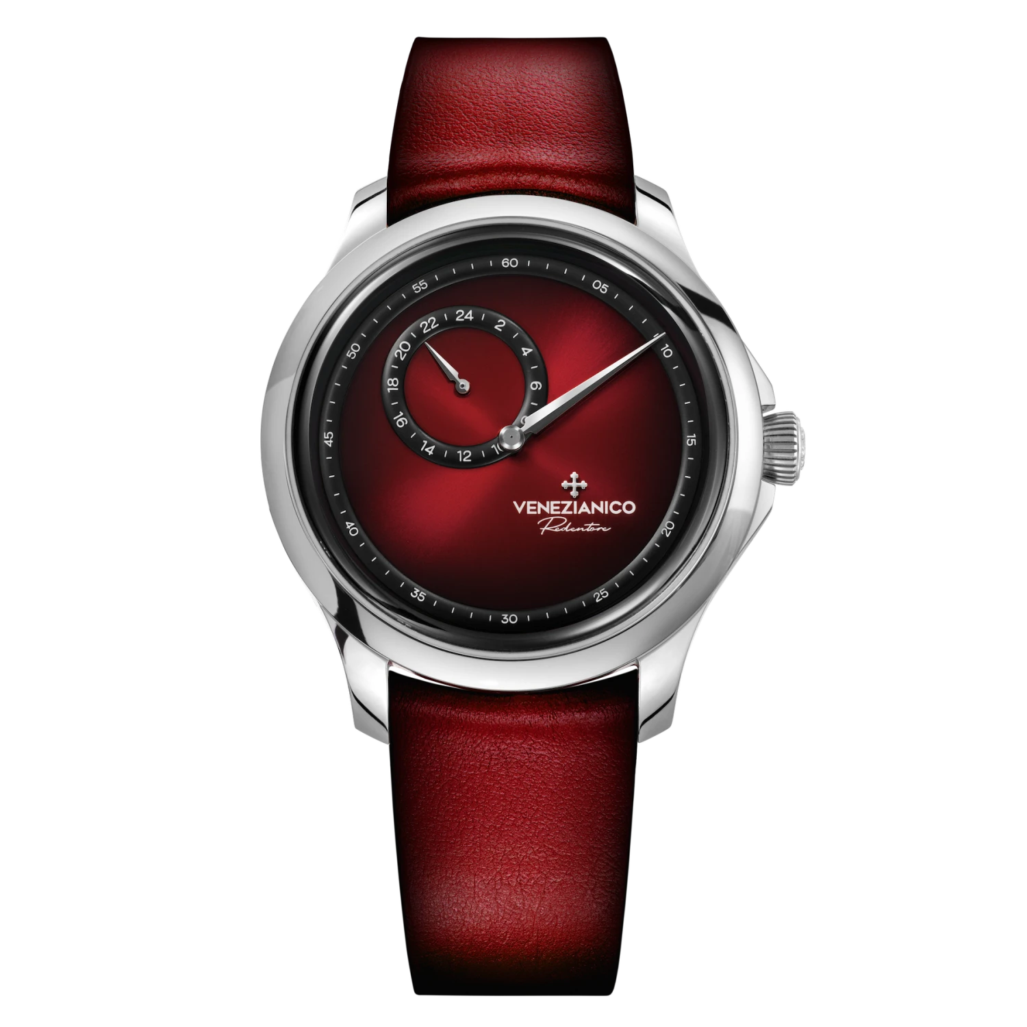 The Redentore Enigma stands out for its regulator complication. This model offers an innovative way to tell time, with the dial divided into two sectors: a small counter that marks the hours in 24 segments and a central hand that indicates the minutes. The simple design incorporates the stylistic elements of the Redentore, featuring a clean dial free of indices and adorned with elegant dauphine hands. The balance between innovation and tradition makes the Redentore Enigma an elegant and versatile model.