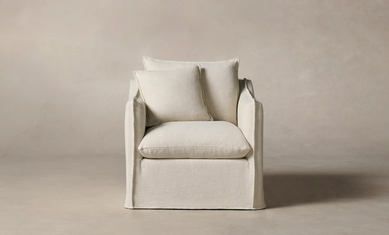 The Dune chair is a vision of effortlessness and ease. It boasts a deep seat, plush cushioning, and relaxed slipcover with hand-sewn flange seams for an elegant finish. Handcrafted in North Carolina.