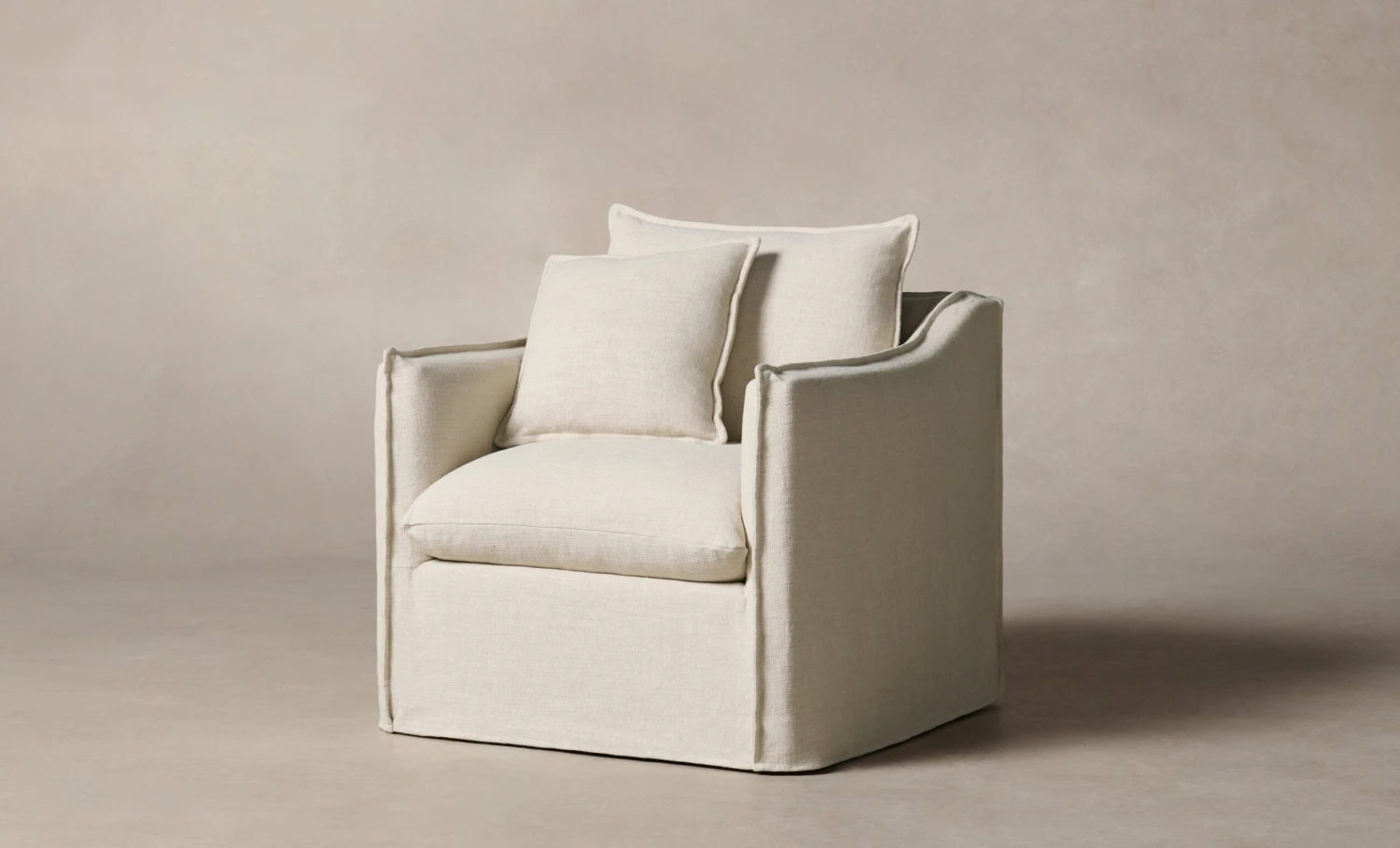 The Dune swivel chair is a vision of effortlessness and ease. It boasts a deep seat, plush cushioning, and relaxed slipcover with hand-sewn flange seams for an elegant finish. Handcrafted in North Carolina.