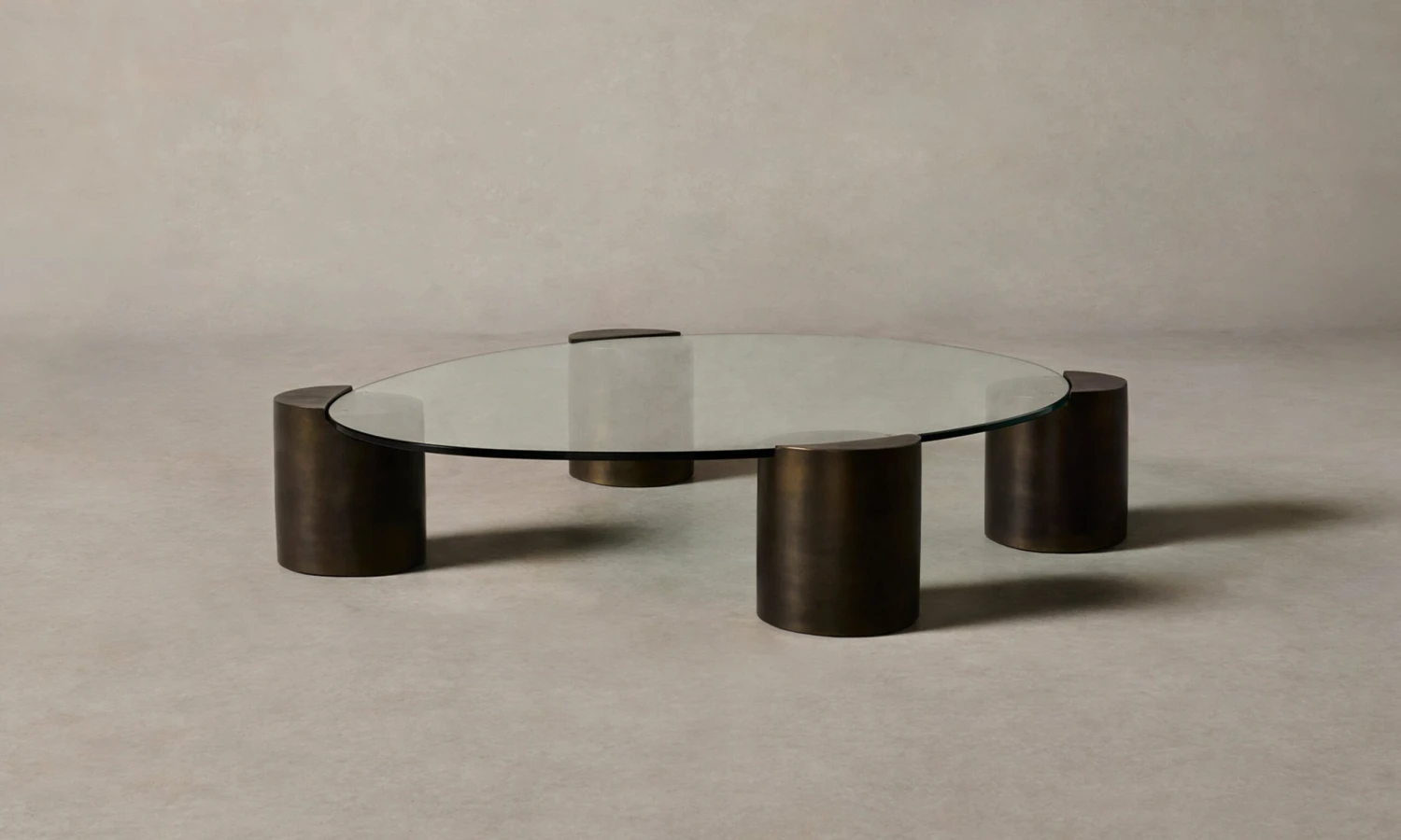 The Ella coffee table is a testament to the magic that transpires when exquisite materials come together. Its curvaceous glass tabletop rests upon cylindrical legs with a hand-applied bronze finish.