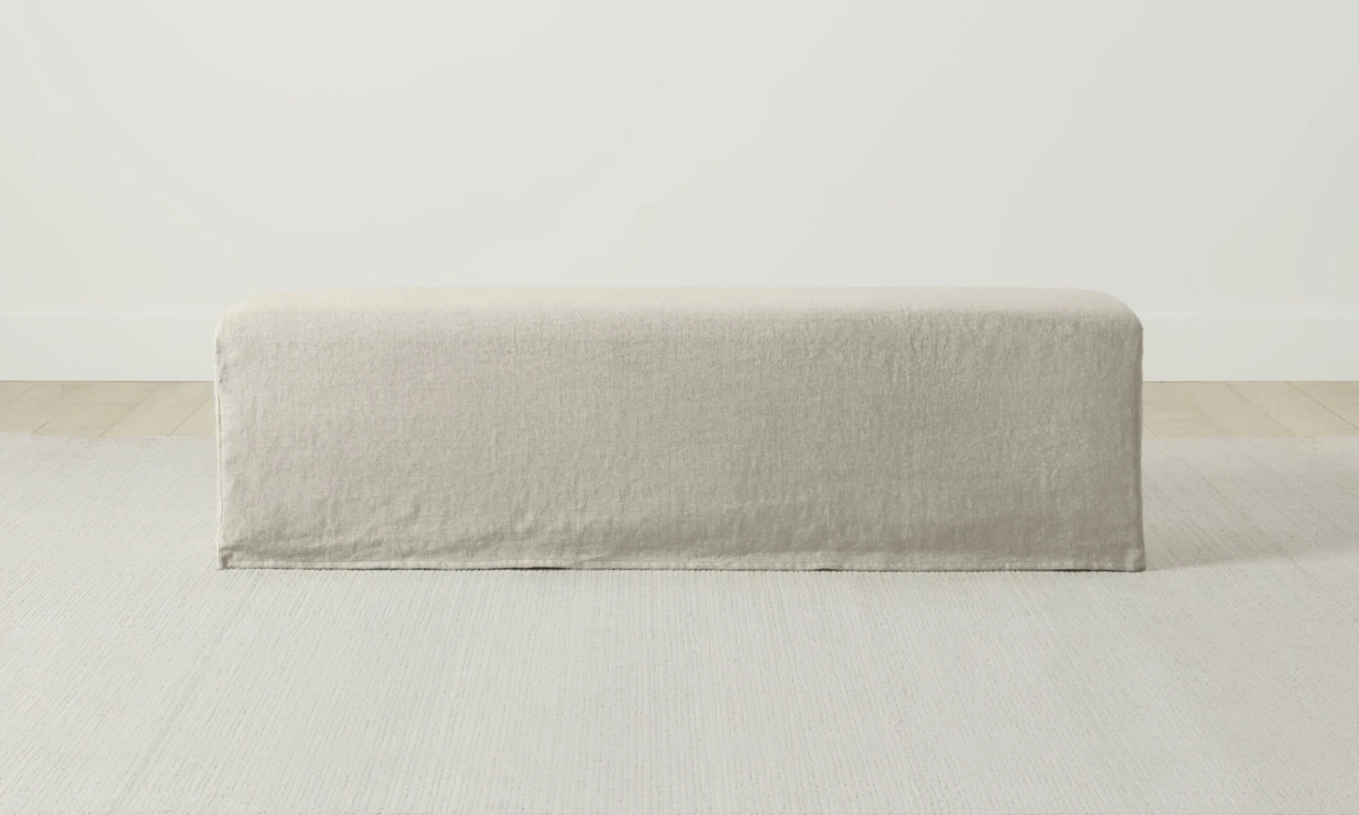 The Franklin bench is distinguished by its simplicity. It has an understated silhouette with a cushioned seat and hand-sewn slipcover that drapes softly to the floor. Handcrafted in North Carolina.