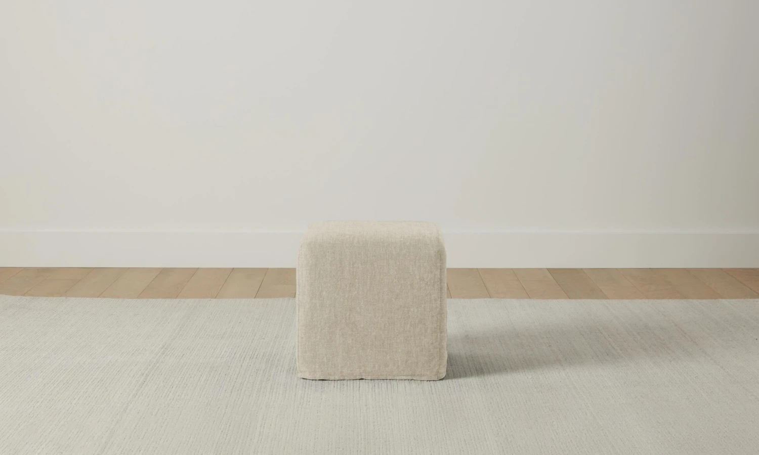 The Franklin ottoman is distinguished by its simplicity. It has an understated silhouette with a cushioned seat and hand-sewn slipcover that drapes softly to the floor. Handcrafted in North Carolina.