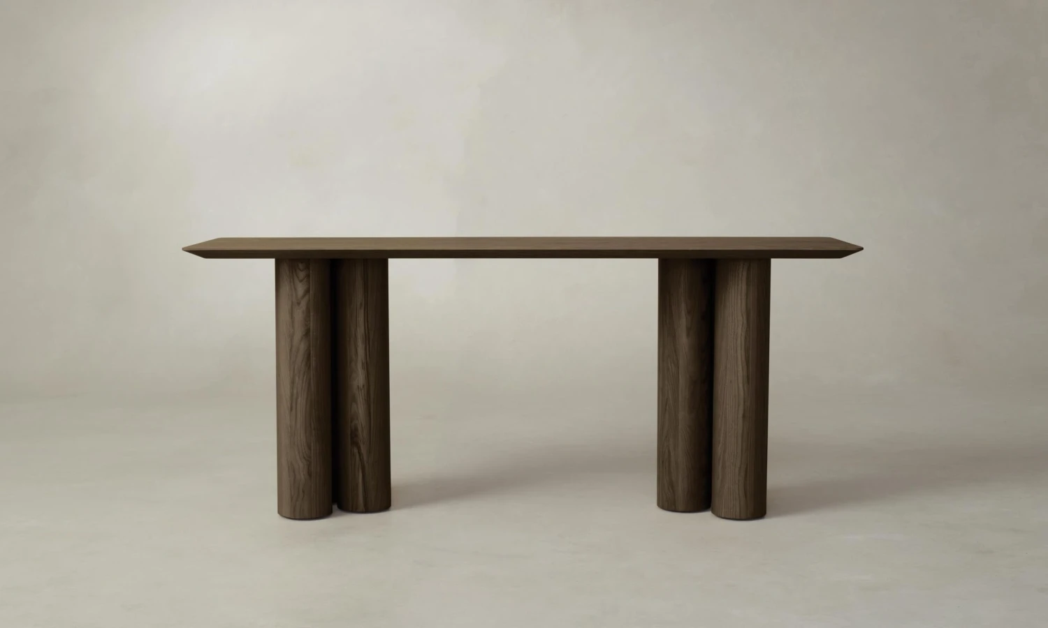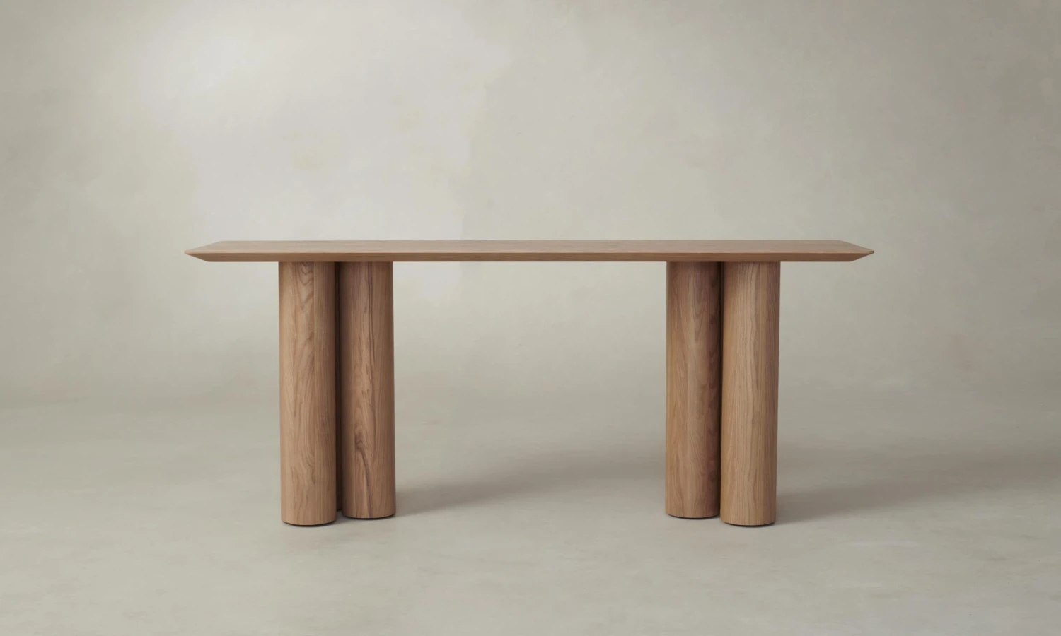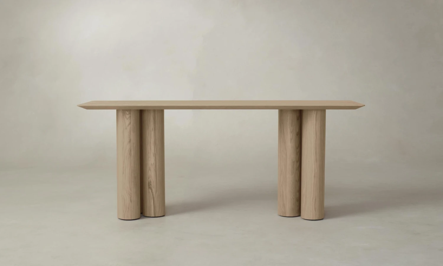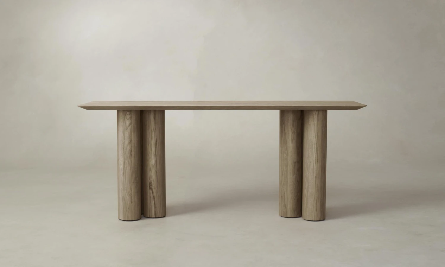 In the Reade console table, strong and sculptural forms collide. The design features a rectangular tabletop and columnar legs, each shaped from solid ash by Amish artisans. Handcrafted in Ohio.