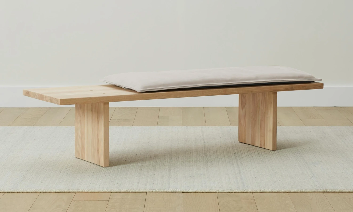 The Reyes bench underscores the allure of honest materials. Its linear ash seat is detailed with brass inlays that add touches of warmth, while the optional Nubuck Leather cushion offers a sumptuous layer of softness. Handcrafted in North Carolina.