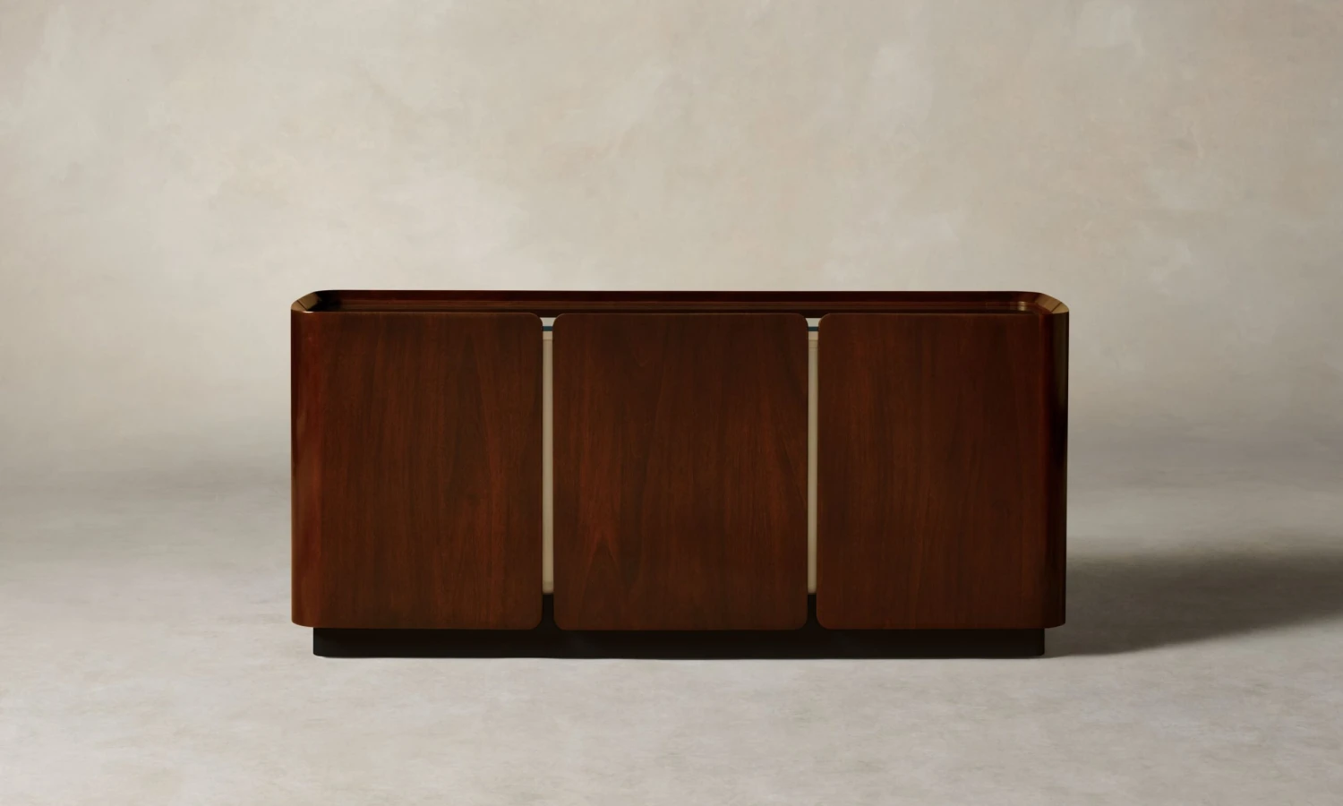 The Sabine 3-door sideboard draws inspiration from Parisian tailoringâthe masterful construction, exquisite materials, and elegant details. Featuring a back-painted glass top and mahogany or white oak exterior, it opens to reveal a lacquer interior that recalls the silk lining of a fine suit.